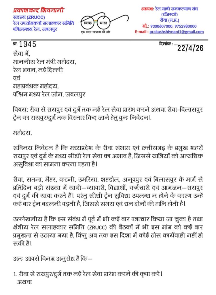 रीवा। रीवा संभाग से छत्तीसगढ़ के प्रमुख शहरों रायपुर एवं दुर्ग तक सीधी रेल सेवा प्रारंभ करने की मांग एक बार फिर जोर पकड़ने लगी है। क्षेत्रीय रेल सलाहकार समिति (ZRUCC) के सदस्य प्रकाश शिवनानी ने इस संबंध में रेल मंत्री एवं पश्चिम मध्य रेलवे, जबलपुर के महाप्रबंधक को पुनः पत्र भेजकर जनहित में शीघ्र कार्यवाही की मांग की है।
