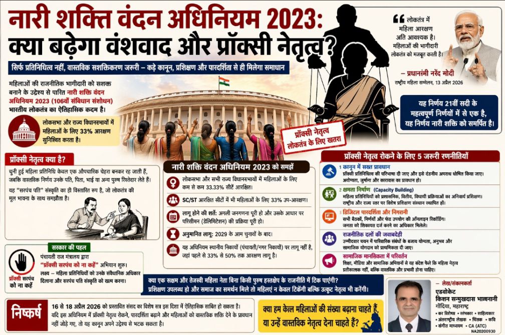 गोंदिया -वैश्विक स्तरपर भारत में महिलाओं की राजनीतिक भागीदारी को सशक्त बनाने के उद्देश्य से पारित नारी शक्ति वंदन अधिनियम 2023(106वां संशोधन) (महिला आरक्षण विधेयक) भारतीय लोकतंत्र के इतिहास में एक ऐतिहासिक मील का पत्थर माना जा रहा है महिलाओं को लोकसभा और राज्यविधानसभाओं में 33 प्रतिशत आरक्षण देकर नीति- निर्माण में उनकी भागीदारी सुनिश्चित करता है।आलोचकों का मानना है कि इससे प्रॉक्सी नेतृत्व (पति/पिता के नाम पर महिला प्रतिनिधि)और वंशवाद/भाई-भतीजावाद बढ़ सकता है, जबकि समर्थक इसे महिलाओं के सशक्तिकरण का ऐतिहासिक कदम मानते हैं।आलोचक तर्क देते हैं कि ग्रामीण या जमीनी स्तरपर पुरुष नेता अपनी पत्नियों या बेटियों को उम्मीदवार बनाकर पर्दे के पीछे से शासन कर सकते हैं।यह भी आशंका जताई जा रही है कि पहले से स्थापित राजनीतिक परिवार अपनी महिला सदस्यों को सीटें दिलाने के लिए इसका इस्तेमाल कर सकते हैं।मैं एडवोकेट किशन सनमुखदास भावनानीं गोंदिया महाराष्ट्र यह बताना चाहूंगा क़ि वैसे ग्रामीण स्तरपर प्रॉक्सी सरपंच के ऊपर सरकार ने एक्शन लिया है वैसा ही नियम नारी शक्ति वंदन अधिनियम 2023 में भी बनाना जरूरी है।13 अप्रैल 2026 को पीएम ने राष्ट्रीय स्तर के महिला सम्मेलन में कहा कि लोकतंत्र में महिला आरक्षण अति आवश्यक है महिलाओं की भागीदारी लोकतंत्र को मजबूत करती है,मैं अत्यंत जिम्मेदारी के साथ कह रहा हूं कि यह 21वीं सदी के महत्वपूर्ण निर्णयों में से एक है,यह निर्णय नारी शक्ति को समर्पित है,नारी शक्ति वंदन को समर्पित हैं।बता दें दशकों से लंबित इस मांग को संवैधानिक स्वरूप देकर यह अधिनियम महिलाओं को विधायिका में समान भागीदारी की दिशा में आगे बढ़ाता है।किंतु इस ऐतिहासिक पहल के साथ- साथ कई जमीनी चुनौतियां और संरचनात्मक समस्याएं भी सामने आती हैं,जिनका समाधान किए बिना यह आरक्षण केवल संख्यात्मक प्रतिनिधित्व तक सीमित रह सकता है,वास्तविक नेतृत्व तक नहीं पहुंच पाएगा? यहां सबसे बड़ा प्रश्न यह उठता है कि क़्या इस अधिनियम से वंशवाद तथा प्रॉक्सी नेतृत्व शुरू नहीं हो जाएगा? क्या केवल आरक्षण देने से महिलाओं का वास्तविक नेतृत्व सुनिश्चित हो जाएगा?भारत के ग्रामीण और शहरी स्थानीय निकायों के अनुभव बताते हैं कि ऐसा जरूरी नहीं है। अनेक मामलों में चुनी हुई महिला प्रतिनिधि केवल एक औपचारिक चेहरा बनकर रह जाती हैं,जबकि वास्तविक निर्णय उनके पति, पिता,भाई या अन्य पुरुष रिश्तेदार लेते हैं। इस प्रवृत्ति को आम भाषा में सरपंच पति या प्रॉक्सी नेतृत्व कहा जाता है। यह समस्या केवल पंचायत स्तर तक सीमित नहीं है, बल्कि कई बार राज्य और राष्ट्रीय स्तर की राजनीति में भी देखने को मिलती है।यह स्थिति लोकतंत्र की मूल भावना जनता द्वारा,ज