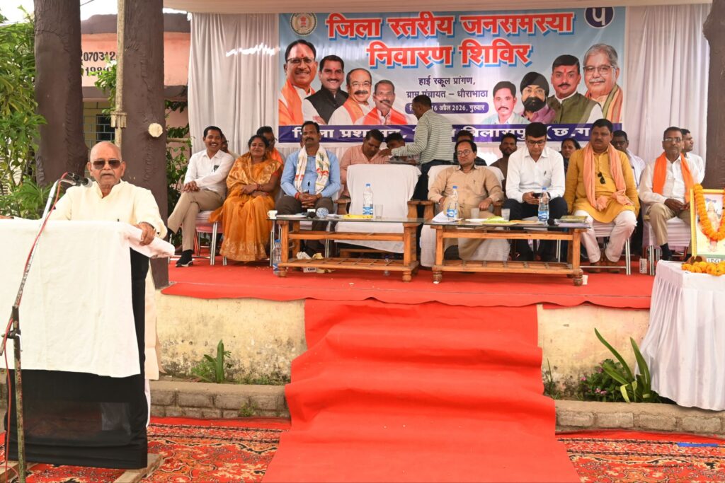 बिलासपुर, 16 अप्रैल 2026/बिल्हा ब्लॉक के ग्राम धौराभांठा में आयोजित जनसमस्या निवारण शिविर में शासन की योजनाओं को धरातल पर उतारते हुए ग्रामीणों को सीधे लाभ पहुंचाया गया। प्रशासन ने गांव में पहुंचकर लोगों की समस्याओं का त्वरित निराकरण किया। शिविर में बिल्हा विधायक श्री धरमलाल कौशिक मुख्य अतिथि के रूप में शामिल हुए। कार्यक्रम में जिला पंचायत अध्यक्ष श्री राजेश सूर्यवंशी, जनपद पंचायत अध्यक्ष डॉ. रामकुमार कौशिक, जिला पंचायत सदस्य श्री गोविंद यादव, श्रीमती अनिता राजेंद्र शुक्ला, जनपद उपाध्यक्ष श्री विक्रम सिंह, सरपंच सहित अन्य जनप्रतिनिधि, कलेक्टर श्री संजय अग्रवाल, सीईओ जिला पंचायत श्री संदीप अग्रवाल, एसडीएम आकांक्षा त्रिपाठी, जनपद सीईओ श्री कुमार सिंह लहरे, जिला स्तरीय अधिकारी और बड़ी संख्या में ग्रामीण मौजूद रहे। शिविर में कुल 209 आवेदन प्राप्त हुए, जिनमें से 162 आवेदनों का मौके पर ही निराकरण कर हितग्राहियों को तत्काल राहत प्रदान की गई।
