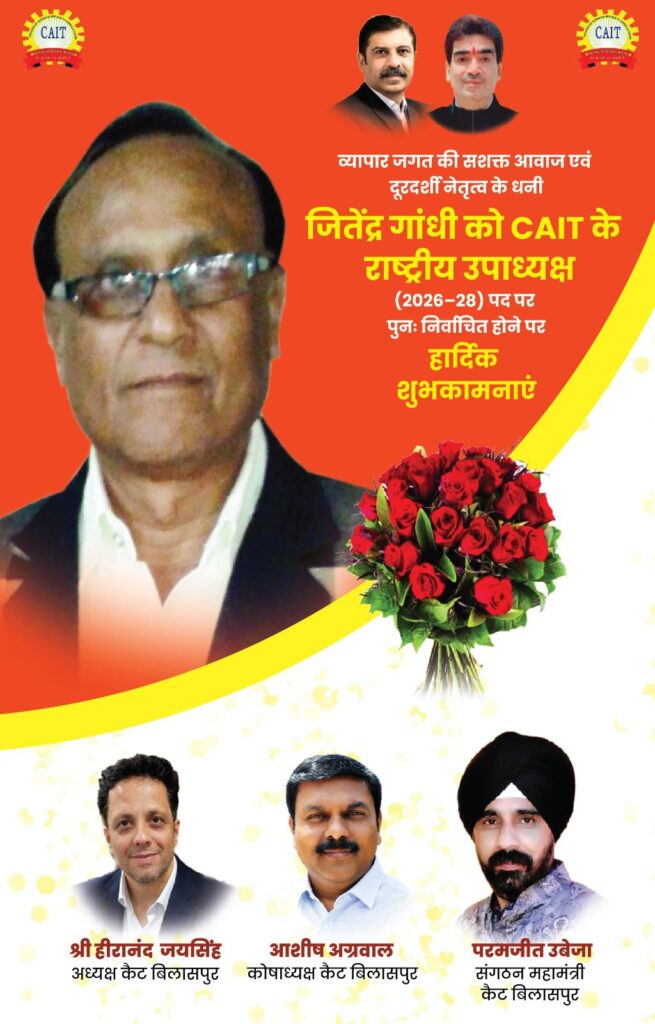 देश के सबसे बड़े व्यापारी संगठन कन्फेडरेशन ऑफ ऑल इंडिया ट्रेडर्स (कैट) के राष्ट्रीय वाइस चेयरमेन एवं राष्ट्रीय व्यापारी कल्याण बोर्ड (भारत सरकार) के सदस्य अमर पारवानी, राष्ट्रीय सचिव राजू सलूजा , राष्ट्रीय उपाध्यक्ष जितेंद्र गांधी,बिलासपुर जिला अध्यक्ष हीरानंद जयसिंह, कोषाध्यक्ष अजय अग्रवाल, कार्यकारी अध्यक्ष दिलीप खेंडेलवाल , सुरेंद्र सिंह अजनानी, संजय मित्तल महामंत्री परमजीत उबेजा , अनिल रघवानी , प्रवीण सलूजा , प्रमोद वर्मा , राजेश सैनी,हरदीप होरा, विष्णु गुप्ता, चंदन कनौडिया , संतोष पांडे , राजेन्द्र सिंह,युवा अध्यक्ष नमित सलूजा ने संयुक्त रूप से बताया कि देश के सबसे बड़े व्यापारी संगठन कन्फेडरेशन ऑफ ऑल इंडिया ट्रेडर्स (कैट) की राष्ट्रीय कार्यकारिणी का गठन दिल्ली में आयोजित दो दिवसीय बैठक में संपन्न हुआ, जिसमें देशभर के 150 से अधिक वरिष्ठ व्यापारी नेताओं की गरिमामयी उपस्थिति रही। इस बैठक में वर्ष 2026-2028 के लिए कैट के राष्ट्रीय पदाधिकारियों का सर्वसम्मति से निर्वाचन किया गया। जिसमें :-