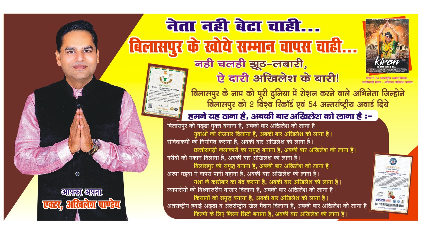 बिलासपुर –::–विधानसभा चुनाव के लिए सुपरस्टार अखिलेश पांडे ने आज अपना घोषणा पत्र जारी कर दिया है इस घोषणा पत्र में उन्होंने टैगलाइन दी है ” नेता नहीं बेटा चाहि बिलासपुर के खोए सम्मान वापस चाहि”इस घोषणा पत्र में उन्होंने बिलासपुर को गड्ढा मुक्त बनाने ,युवाओं को रोजगार दिलाने ,गरीबों को मकान दिलाने, कलाकारों को सम्मान दिलाने, बिलासपुर में फिल्म सिटी एवं बिलासपुर के लिए अंतरराष्ट्रीय हवाई अड्डा ,अंतरराष्ट्रीय मैदान किसानों के लिए समृद्धि आदि विषयों को सम्मिलित किया है इस संदर्भ में जब हमने अखिलेश से बात की तब उन्होंने बताया कि बिलासपुर को अब युवा नेतृत्व की जरूरत है क्योंकि अभी तक जो भी विधायक बिलासपुर से हुए हैं उन्होंने बिलासपुर के लिए विशेष कुछ कार्य किया नहीं है जिससे कि बिलासपुर आज रायपुर से काफी पीछे हो गया है इसलिए अब बिलासपुर को एक सशक्त व्यक्तित्व की आवश्यकता है जो बिलासपुर के जनता की भावनाओं को समझे और उनकी उम्मीदों पर खरा उतर सके इसके अलावा अखिलेश ने कहा कि वह यह चुनाव जनादेश पर ही लड़ रहे हैं क्योंकि उन्हें जनता का पूरा साथ है.पिछले बार कंग्रेस बिलासपुर से जीती नहीं थी जनता ने भाजपा को हराया था क्योंकि कोई विकल्प नहीं था इसलिए बिलासपुर की जनता ने कांग्रेस प्रत्यासी को जिताया था किन्तु इस बार अखिलेश पांडे तीसरे विकल्प के रूप में उभर रहे है .बिलासपुर सामान्य शीट है और अभी तक कांग्रेस और भाजपा के शासन प्रणाली देख चुके है दोनों एक ही थाली के चट्टे बट्टे है इसलिए अबकी बारी अलखिलेश की बारी